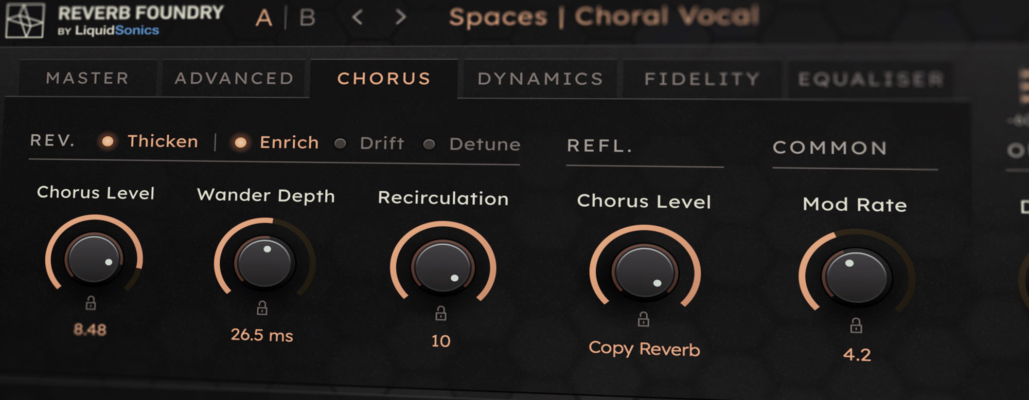 Tai Chi has stunningly rich and luscious choruses. With scores of synchronised modulated reads distributed throughout the reverb it thickens synth and guitars beautifully whilst avoid any of the characteristic dragging sharp and flat that you have heard in chorused reverbs of old, and unison chorus to rapidly build thickness on reflections without artefacts, these are the choruses your synths dream of!