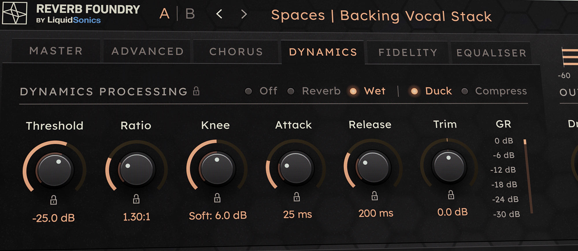 Tai Chi lets you apply dynamics to the wet mix or just the reverb itself. This means the spatialisation provided by the reflection engine is never compromised even when extreme reverb ducking is called for.